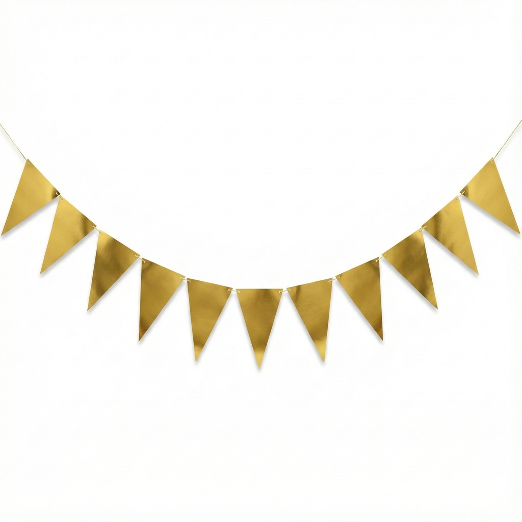 Hängande flaggvimpel/girlang i guld. Trekants vimplar på lina som blir hela 3,6 meter lång. 15 st flaggor med måtten 17 x 23 cm. Dubbelsidig färg.